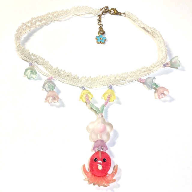 大きなタコちゃんのチョーカーです。 ひとつひとつビーズを編んで作りました。 金具部分にはかわいいお花のチャーム付き! ふんわりとしたトップスなど女の子らしいお洋服に映えます♡ サイズ:全長約34cm+アジャスター約6cm