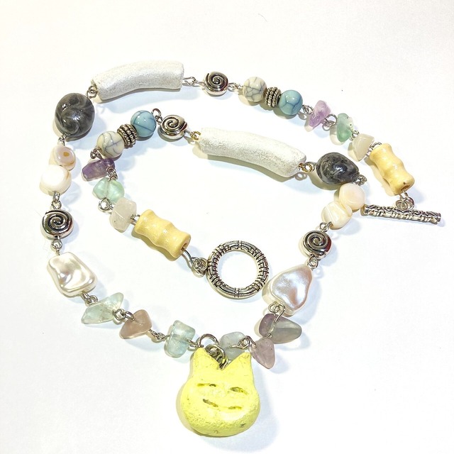 おさんぽで見つけた宝物をつないでみたよ(=^・・^=) ビーズ、天然石に加えて粘土で作ったチャームや、シルバーのパーツなど様々な素材を詰め込んだ個性的なネックレスです。 サイズ:全長約49cm