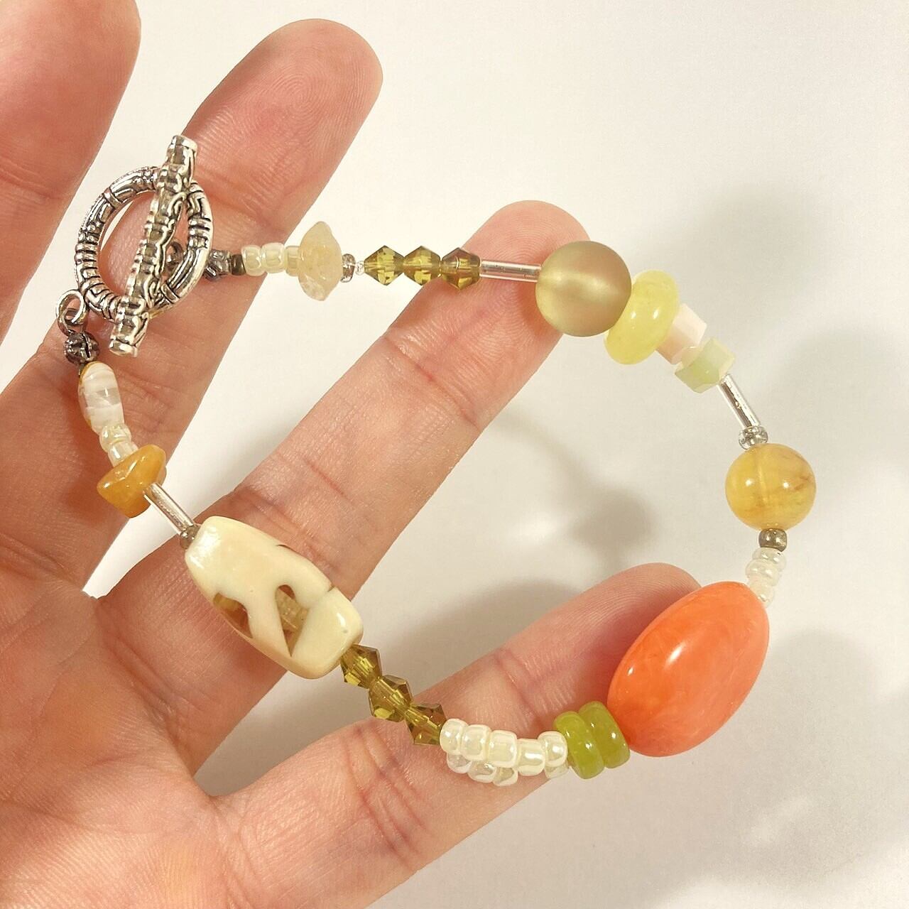 いろいろな形のビーズを組み合わせた暖色カラーのブレスレットです。