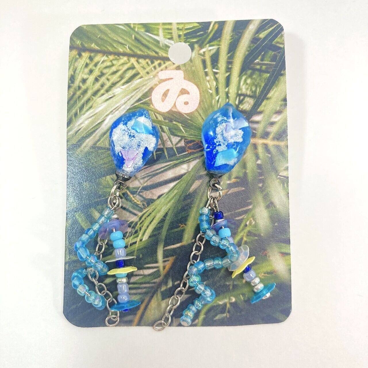 レジンのパーツとビーズを組み合わせた涼しげなピアスです。