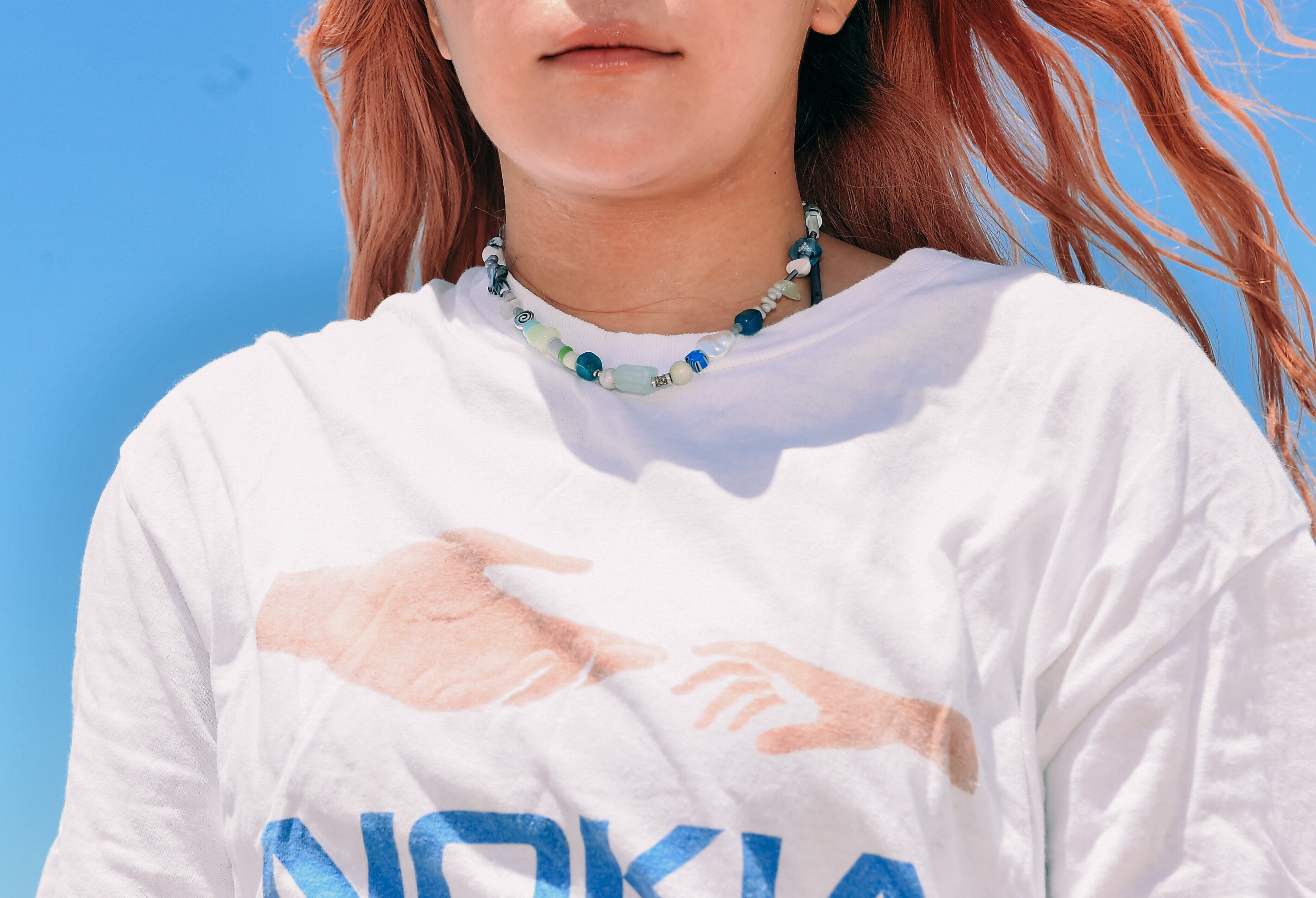 天然石、ガラスビーズ、パールビーズ、シルバーパーツなど様々な素材を使用した個性的なネックレスです。