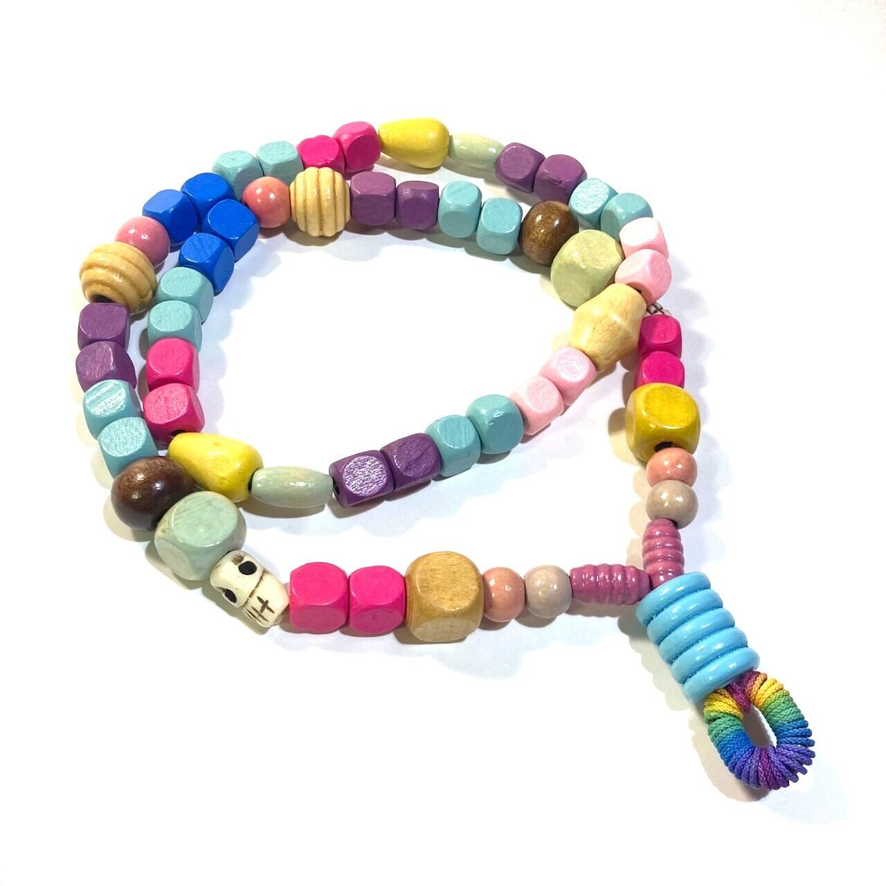 ウッドビーズとボタンを使用し、チャーム部分はチェーンのパーツにコードを巻き付けて作っています。