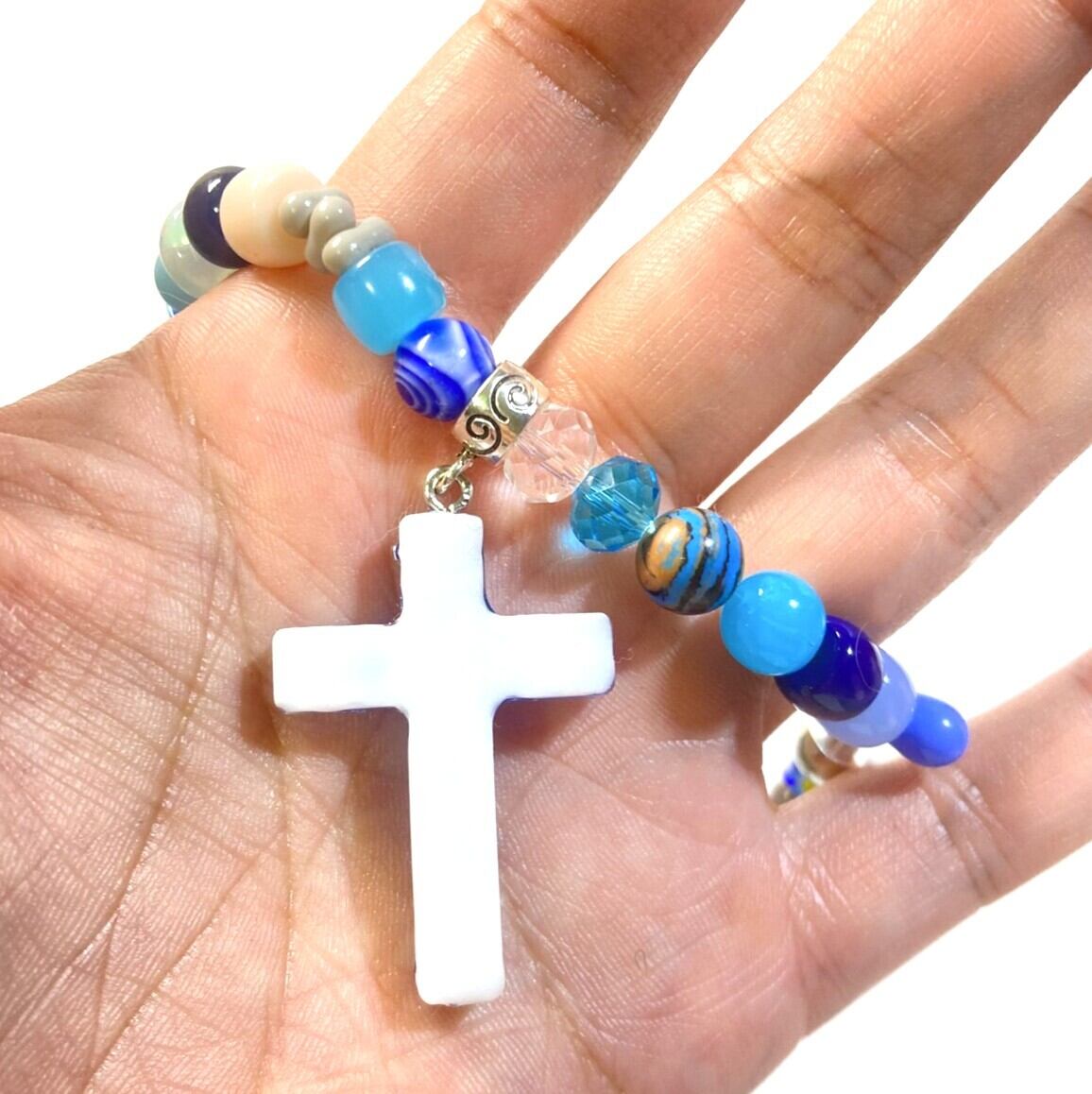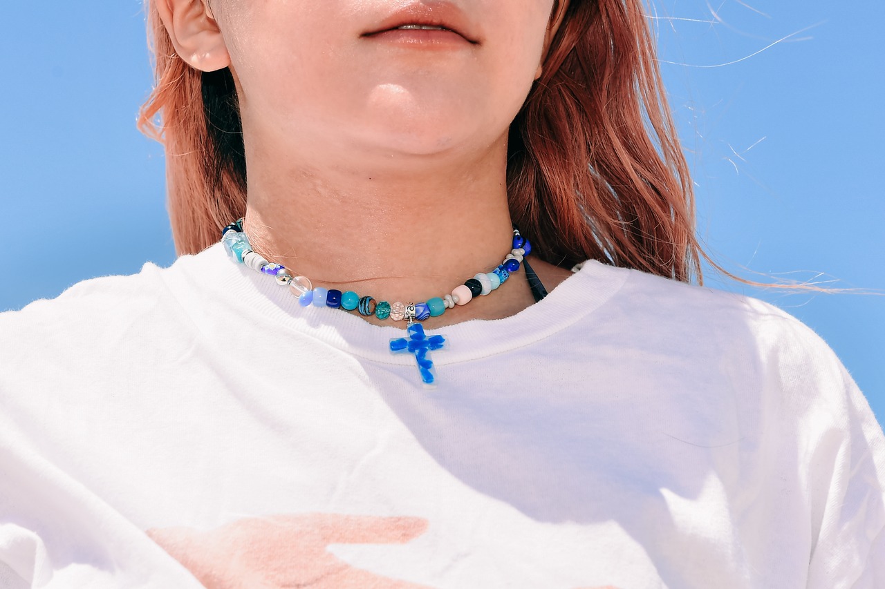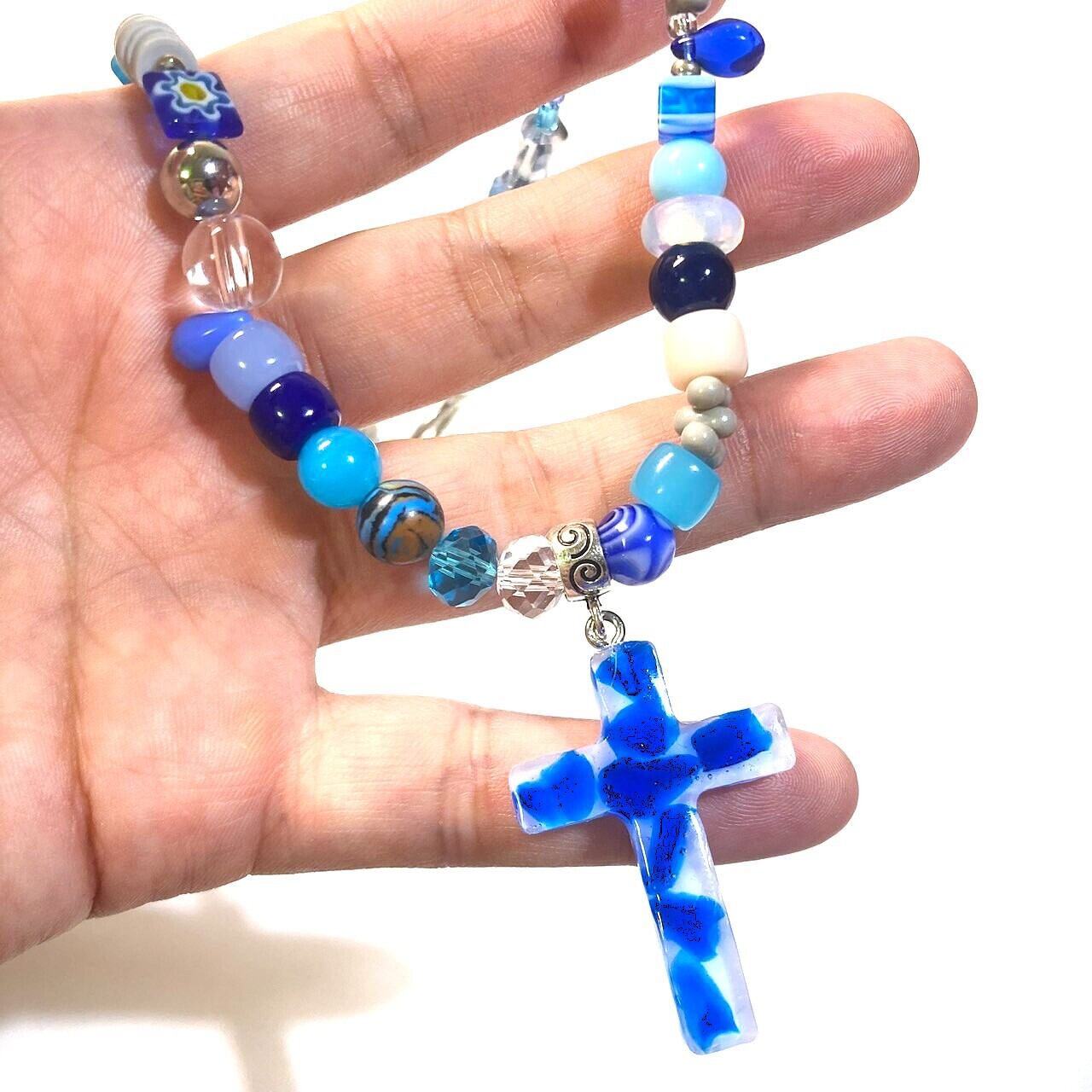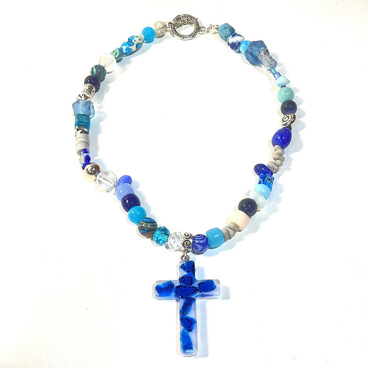 レジンのクロスと、同系色の素材を集めたネックレスです。