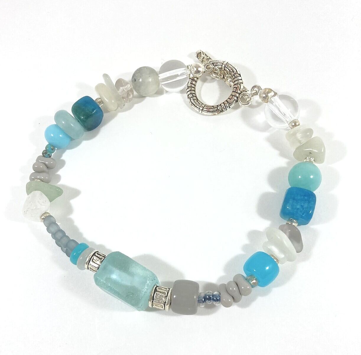 大きめなブルーのガラスビーズがポイントの涼しげなブレスレットです。