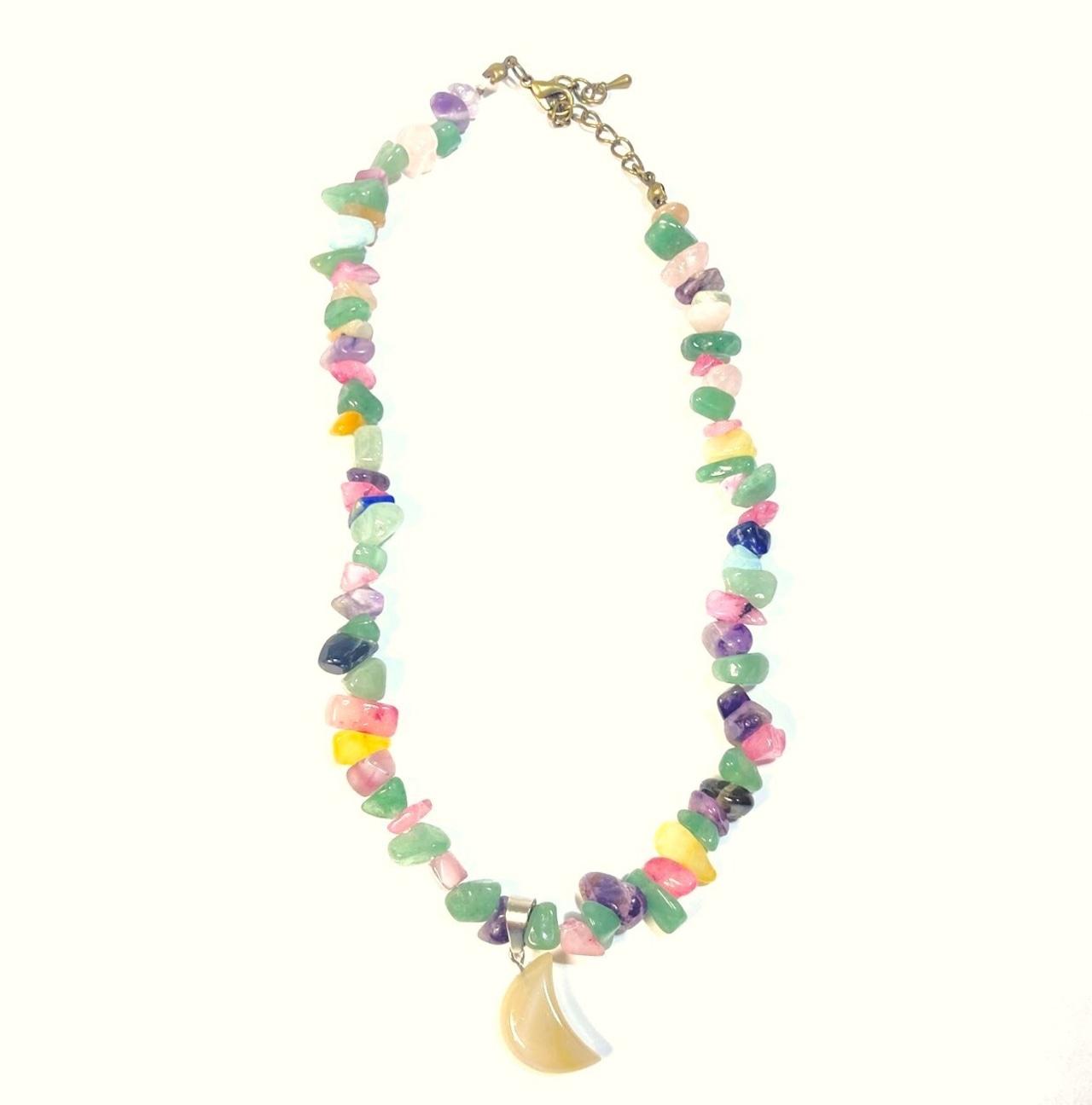 パステルカラーの石たちが連なる中に、クリーム色のムーンチャームがさりげなくポイントとして添えられています。